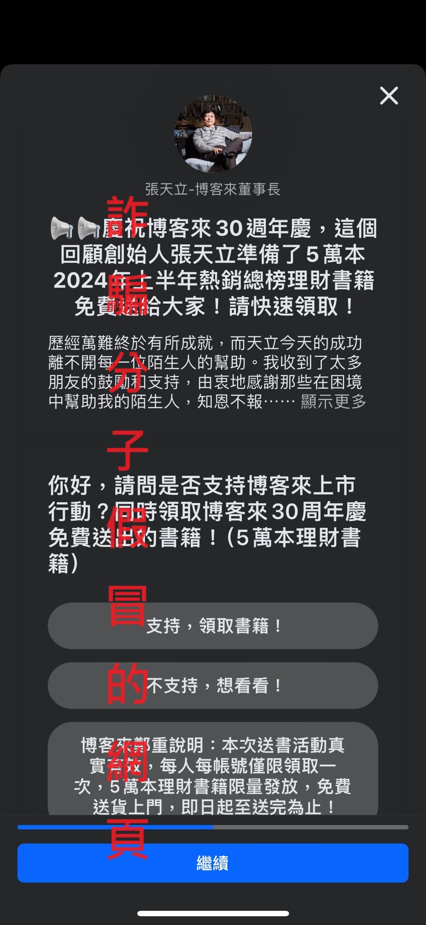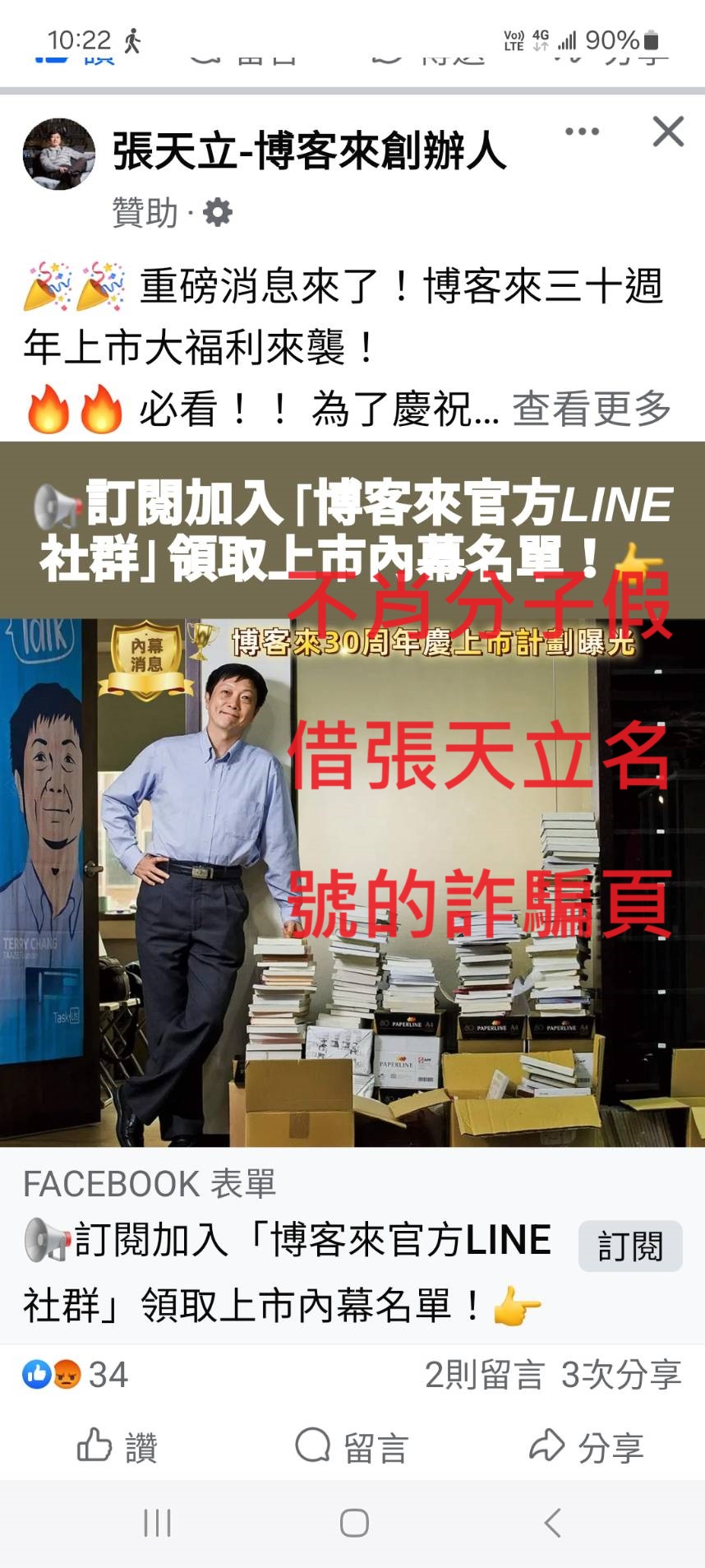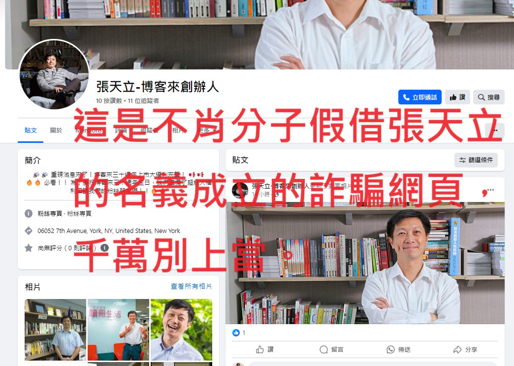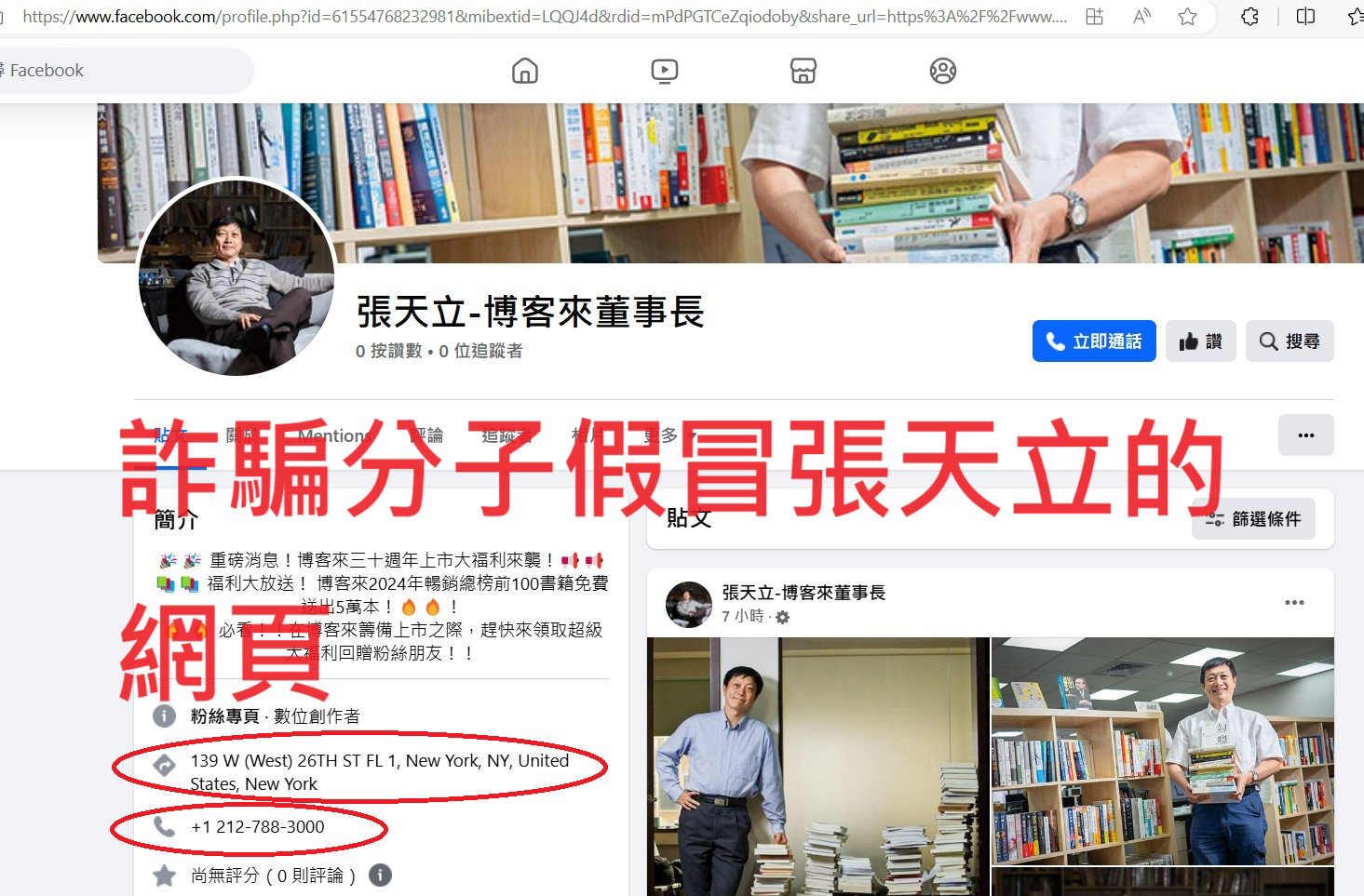 「張天立 博客來董事長」的帳號,都是騙人的,若有要你點連結填資料,絕對別點。張天立鄭重聲明,千萬不要被這些圖片中諸多假冒的粉絲頁欺騙。